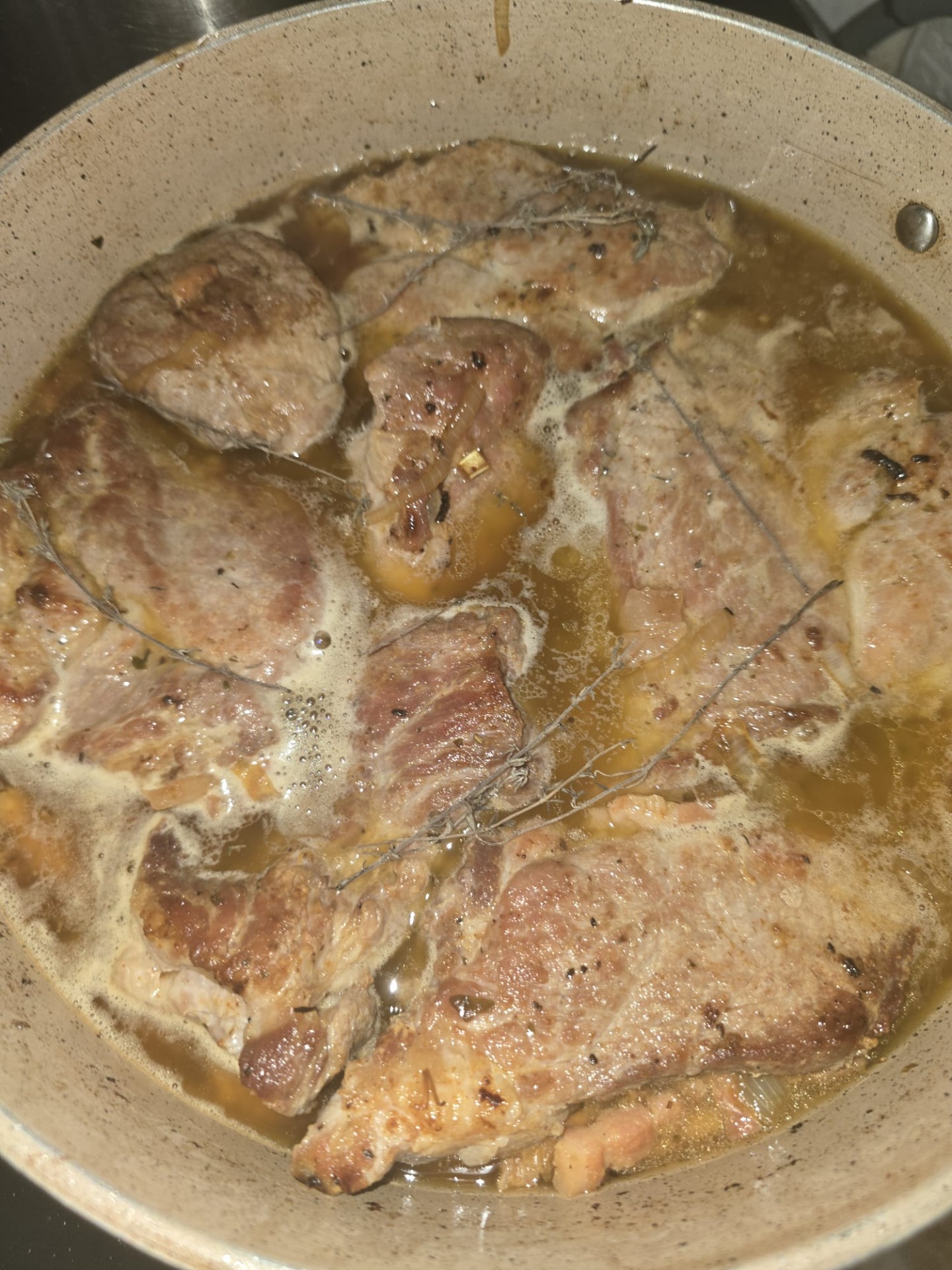 Se mareste flacara aragazului si se toarna vinul alb. Facem asa numitul "deglaze", adica amestecam cu lingura, ca vinul sa curete tot ce este lipit pe fundul cratitei.
